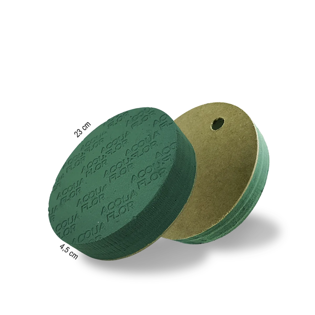 O Mini Disco 23 é a versão menor do Disco 40, com 11,5 cm de diâmetro e 4,5 cm de altura, oferecendo uma base compacta e estável para arranjos florais delicados. Seu formato circular permite criações florais mais ajustadas, perfeitas para centros de mesa, arranjos pequenos, detalhes decorativos e guirlandas, com a mesma qualidade de absorção de água e fixação de caules.